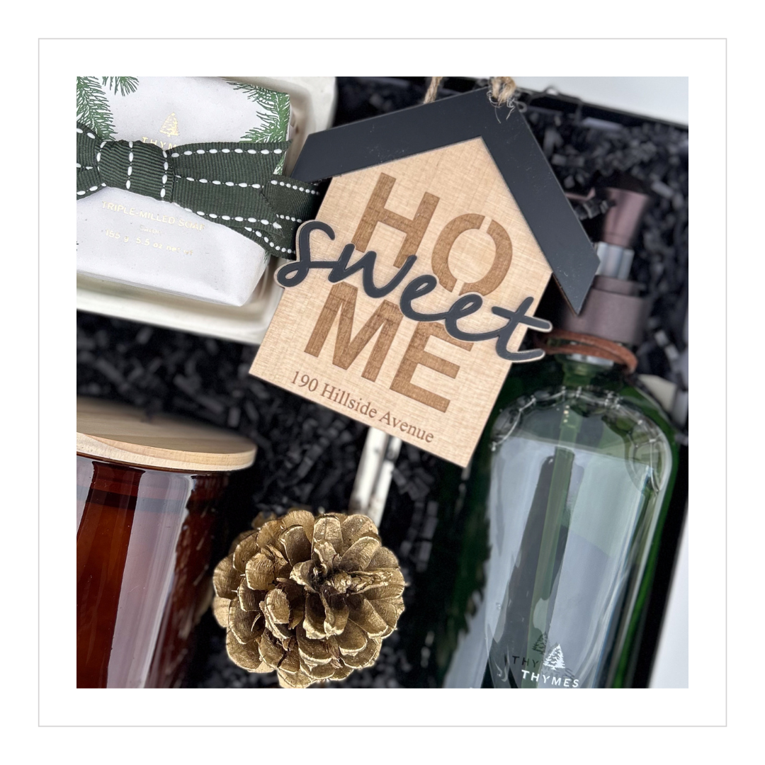 Customize the Wooden "Home Sweet Home" Ornament with your clients address engraved on the front and your personal message on the back.